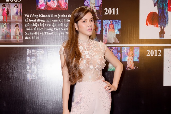 Nữ diễn viên diện bộ đồ hàng hiệu chất liệu xuyên thấu quyến rũ khi tới tham dự buổi trình diễn thời trang Cocoon của nhà thiết kế Võ Công Khanh tối 28/8.
